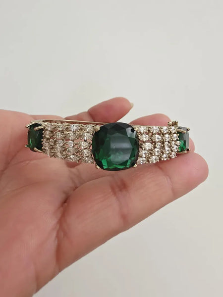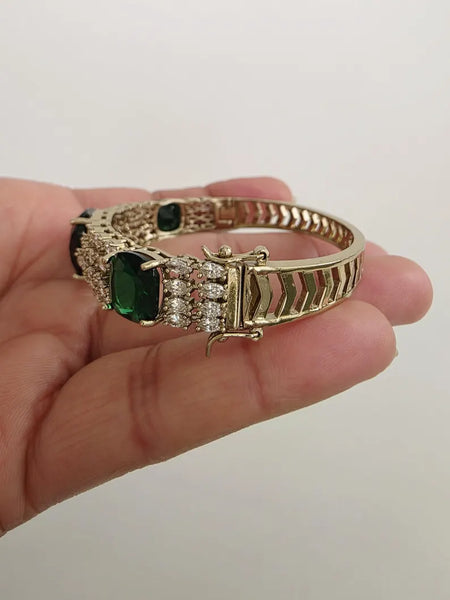 Green Victorian Dull Gold CZ American Diamond openable bracelet one size fit sizes 2.4 and 2.6, single Statement diamond bracelet