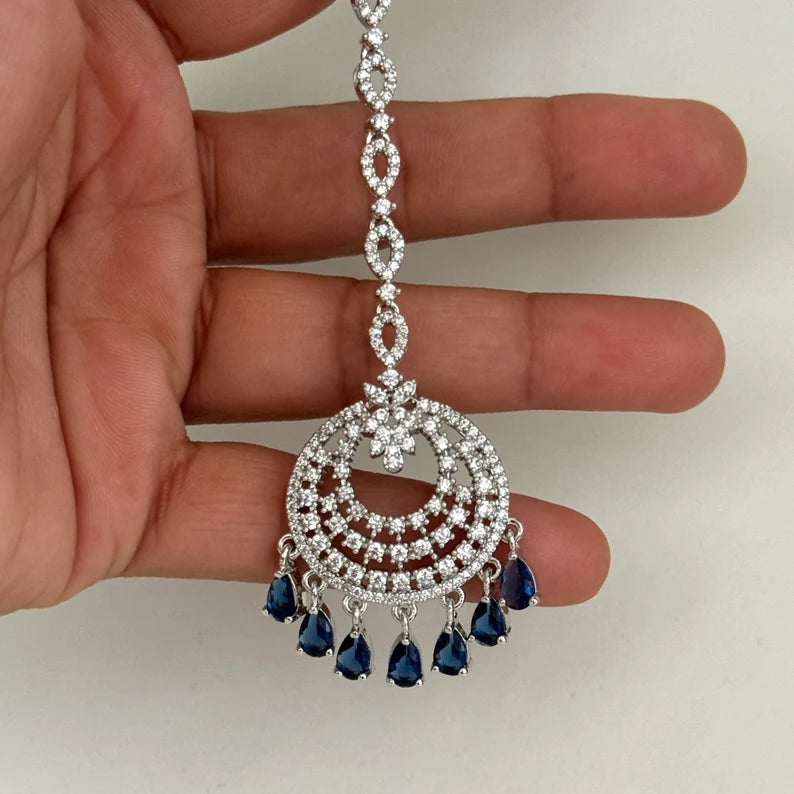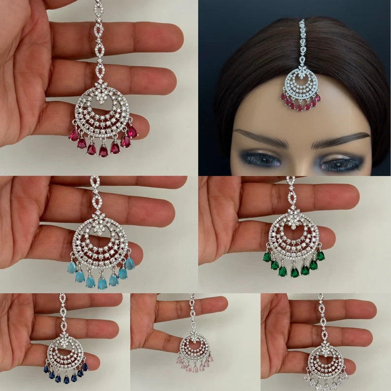 American Diamond Maang tikka/Indian Jewelry/ Indian Wedding Jewelry/ Pakistani Jewelry/ Jhoomer/ Matha patti/ Indian forehead jewelryCubic Zirconia Chand Tikka With Rhodium PlatingClassic DesignAmerican Diamond Maang TikkaHeight = 115 mm || Width = 33 mmThis is 100% Handmade jewelry. So Color, shades, texture displayed may slightly vary from the actual product...
