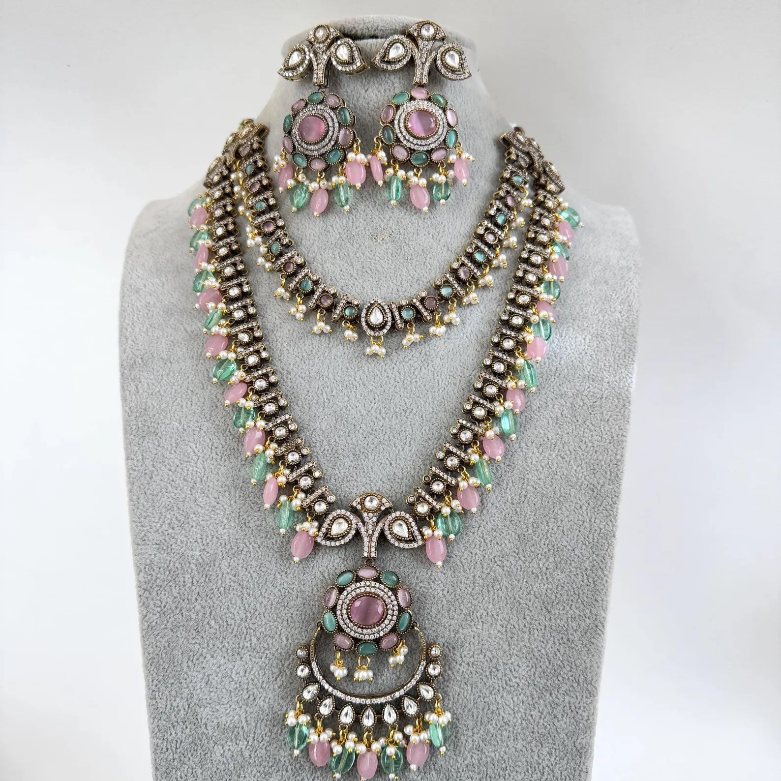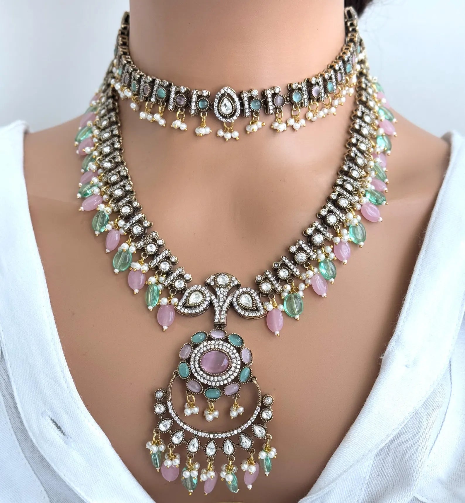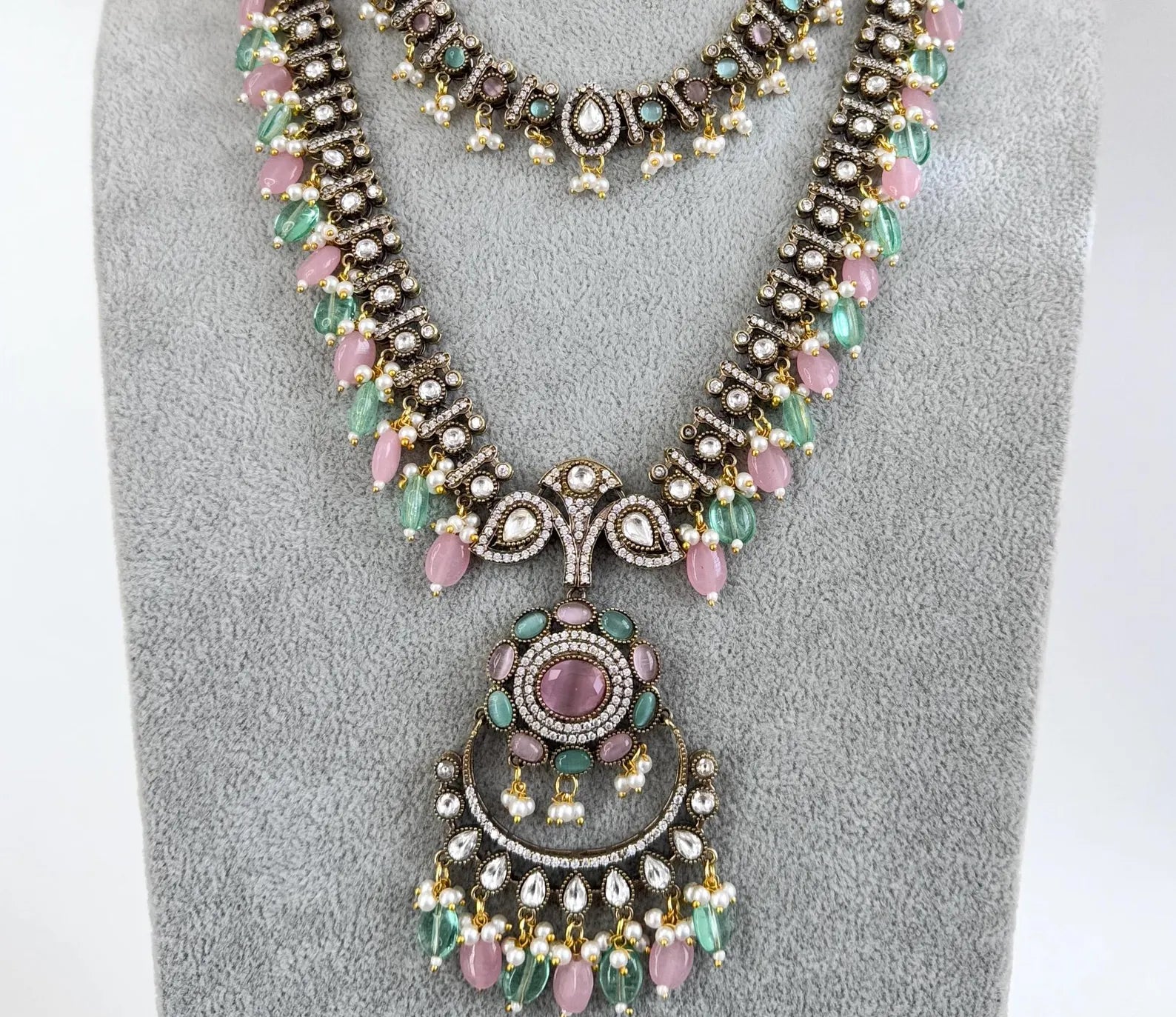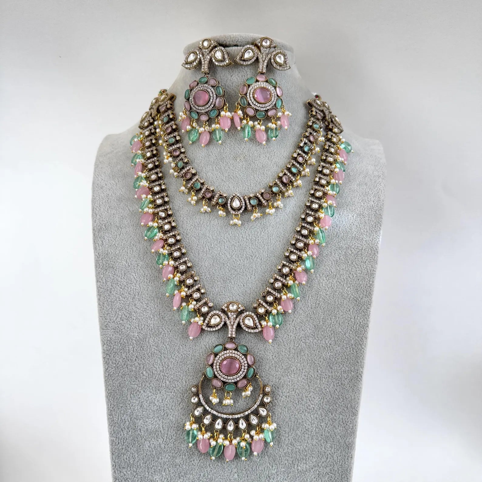 MintPink Premium Quality Victorian Moissanite Polki Kundan Necklace/Statement Long /Semi Precious/Rani Haar/Indian wedding/Bridal Collection