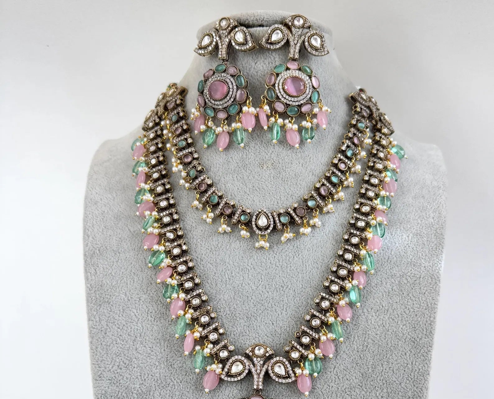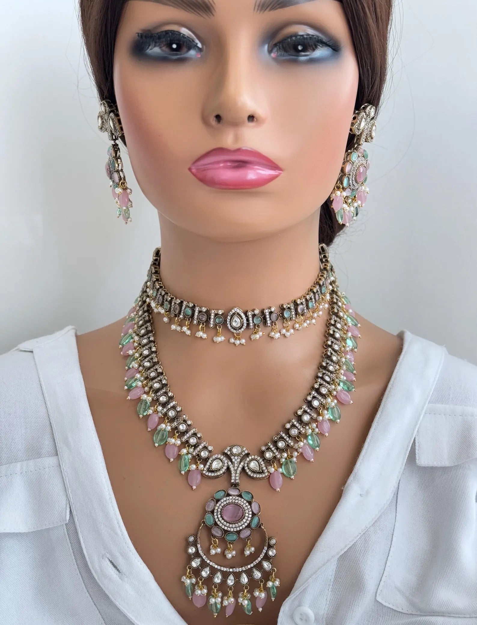 MintPink Premium Quality Victorian Moissanite Polki Kundan Necklace/Statement Long Set/Semi Precious/Rani Haar/Indian wedding/Bridal CollectionVictorian Dull Gold PlatedRegular size and adjustable with a thread closureNecklace Length 20 inchesEarrings Length 3 inch and width of 1.5 inchColor, shades, texture displayed may slightly vary from the actual product due to digital image limitations....